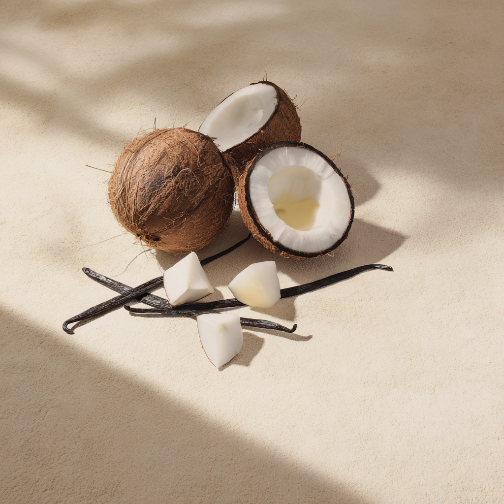 Un doux accord de noix de coco crémeuse et de vanille chaleureuse, pour une fragrance gourmande et enveloppante qui invite à l’évasion.
